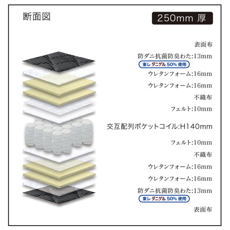 マットレス表面のキルト部の中わたには、抗菌防臭・防ダニ効果のある東レの「ダニゲル®」を50%使用。清潔で快適に眠れます。