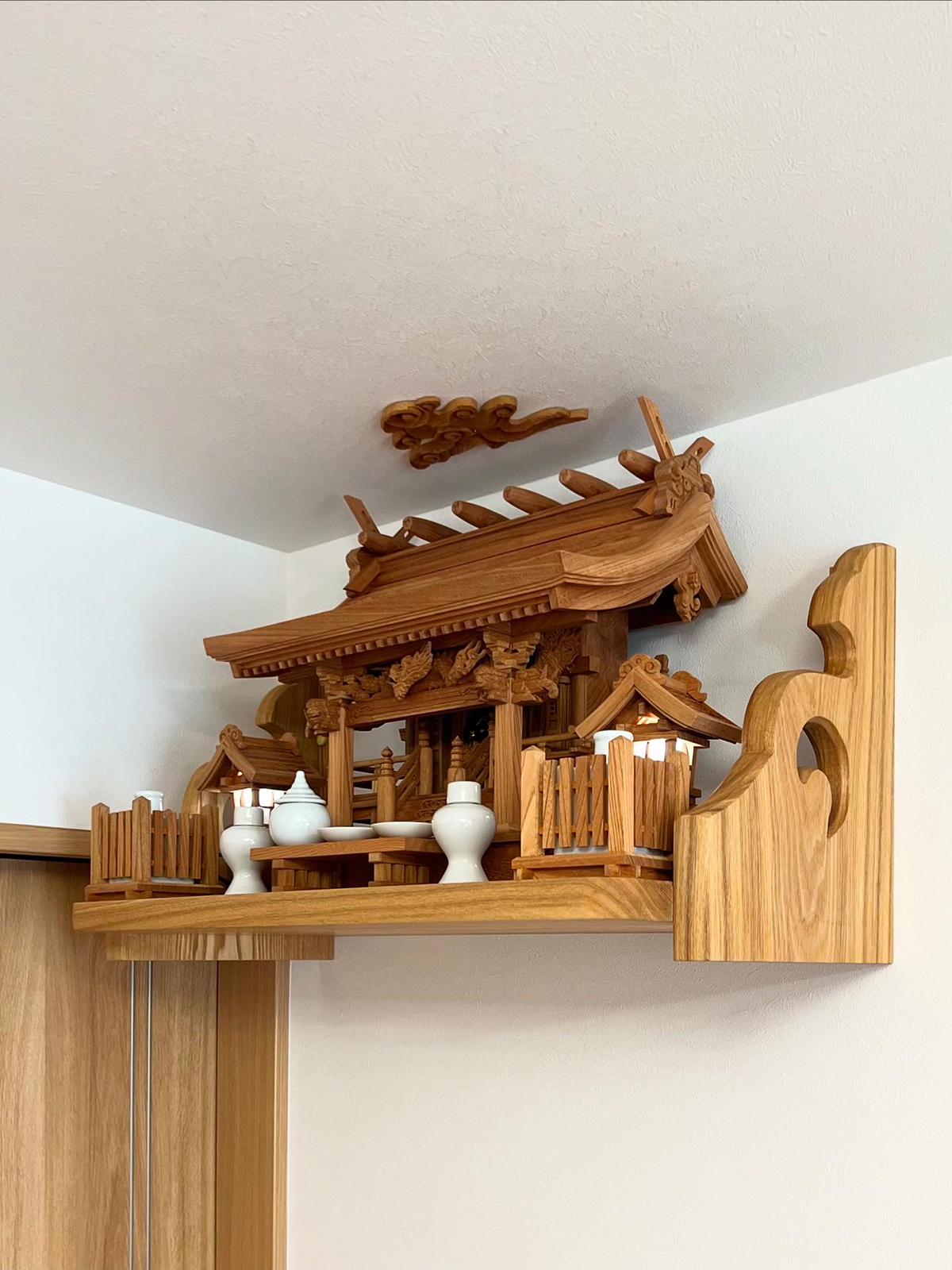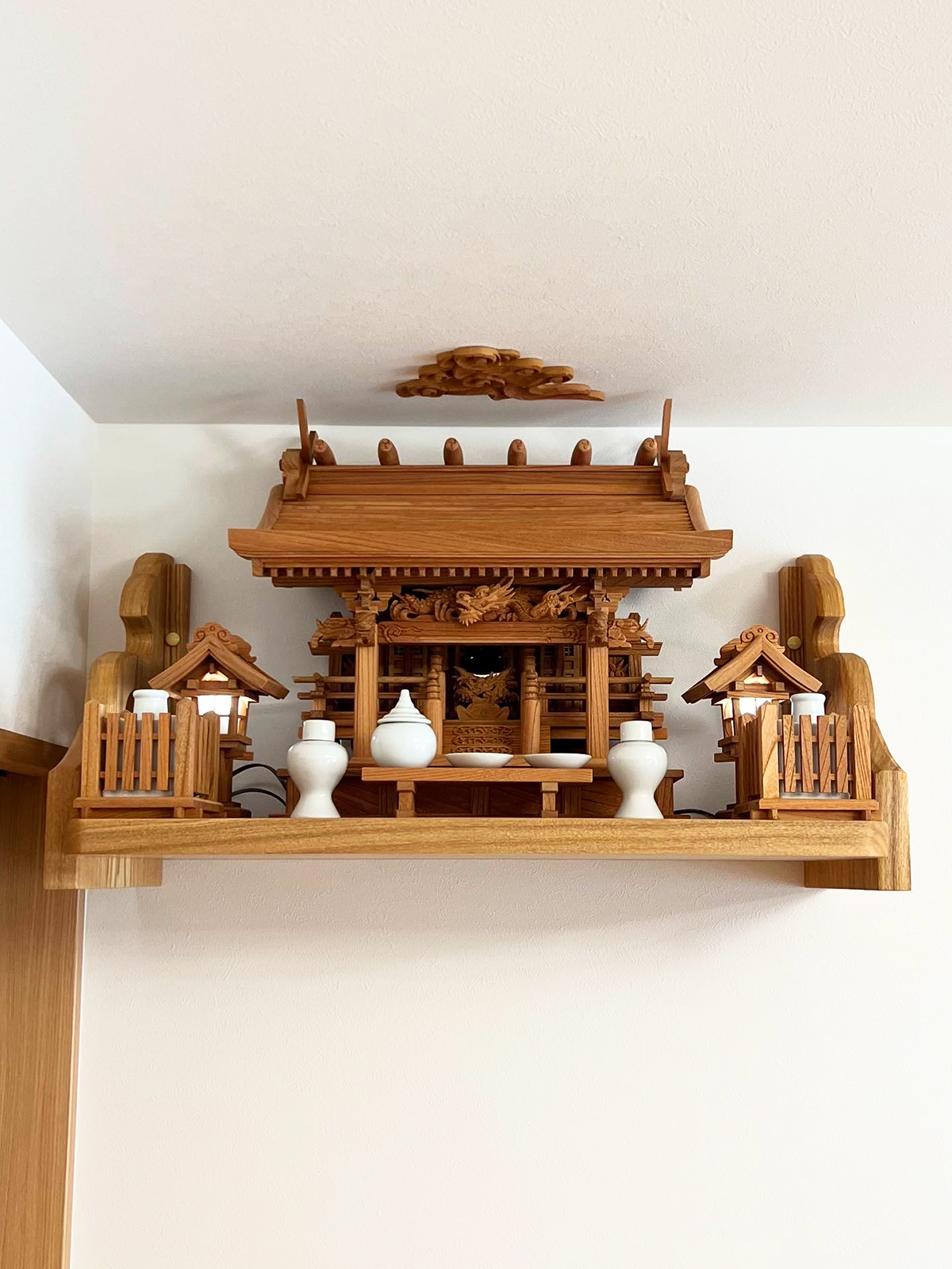 『欅 流れ屋根三社 神棚セット』 納品日:2025年07月 K様邸(富山県高岡市) ご新築のお宅に『欅 流れ屋根三社 神棚セット』をお届けしてきました。 明るいリビングに豪華な神棚セットがとても良い感じでしたよ♪ ありがとうございました。