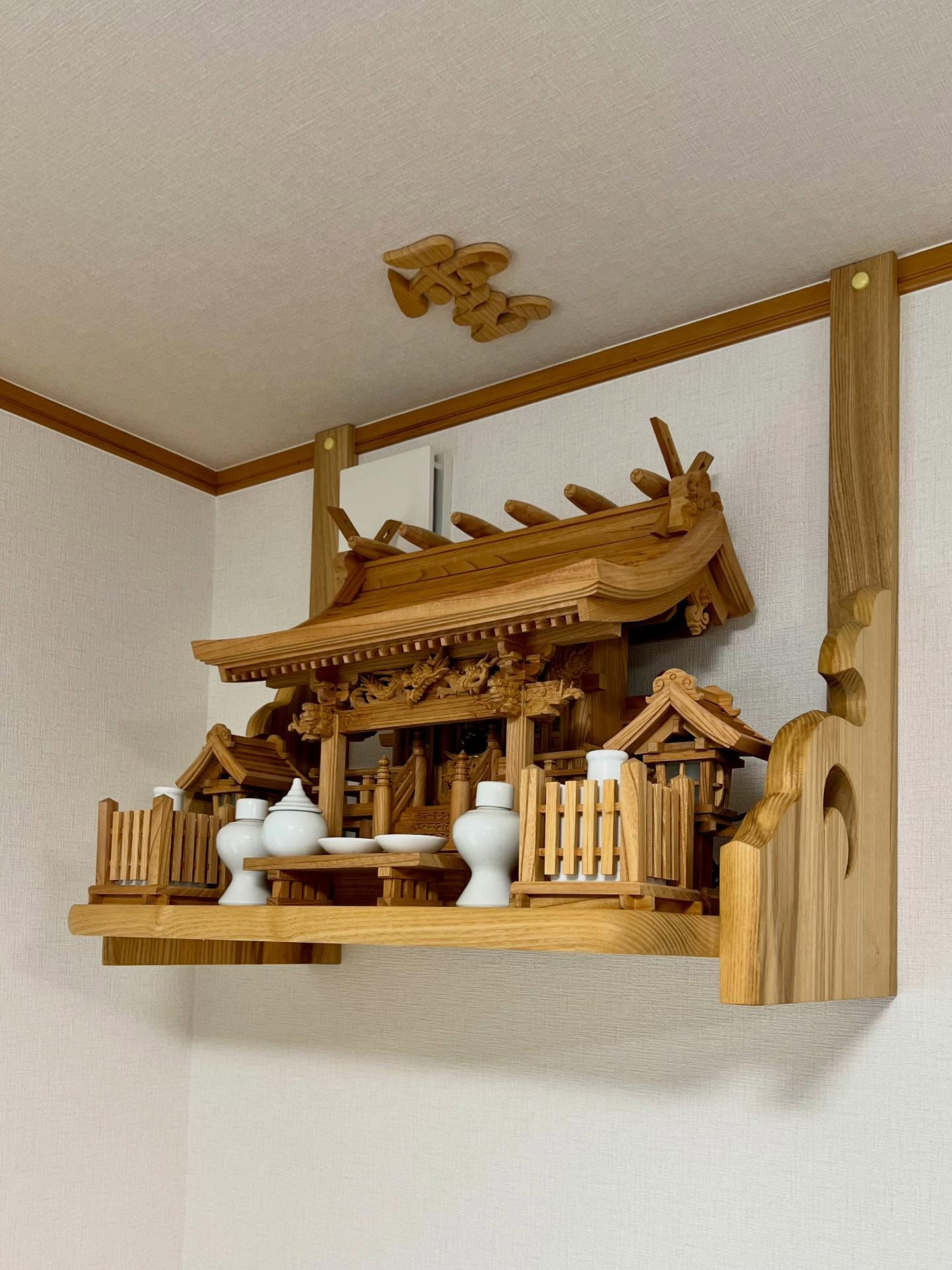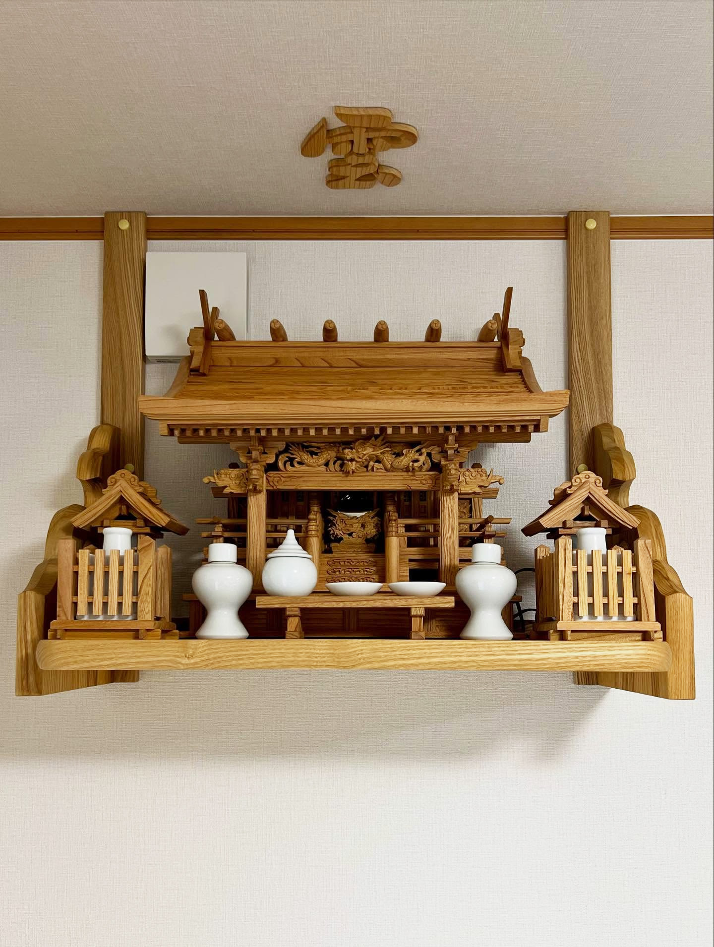『神棚セット 欅 流れ屋根三社』 納品日:2025年09月 〇様邸(富山県砺波市) 『欅 流れ屋根三社 神棚セット』を取り付けてきました。 明るいリビングに『欅 流れ屋根三社』に『タモ無垢の棚板』を合わせたこだわりの神棚セットがとても良い感じでした。 ありがとうございました。