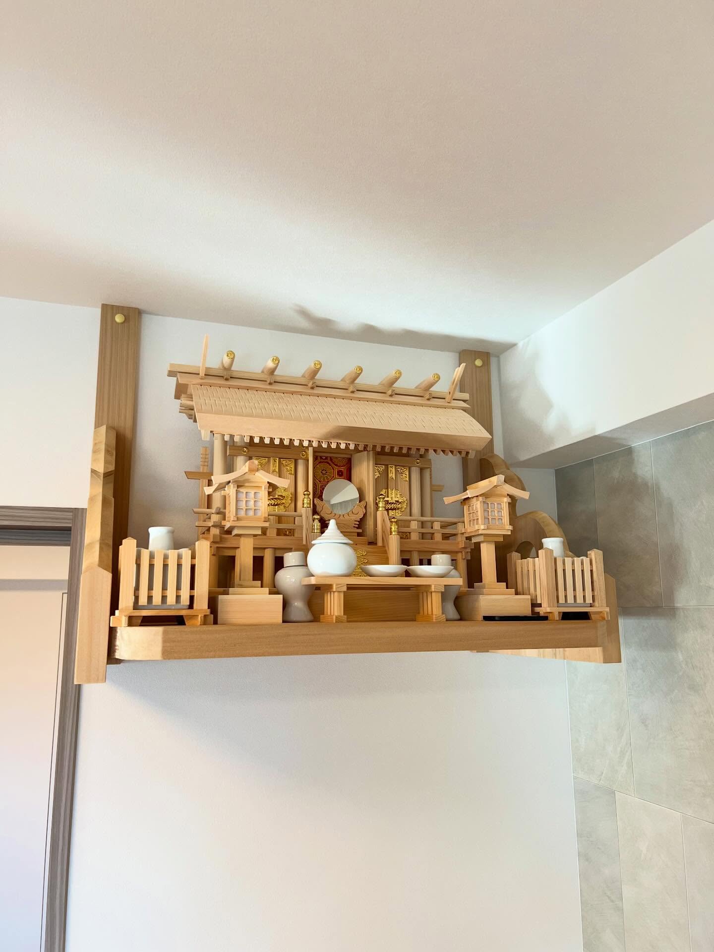 『神棚 桧 彫屋根三社セット』 納品日:2026年01月 ○様邸(富山県富山市) 新築マンションに『桧の神棚セット』を取り付けてきました! 明るいおしゃれなお部屋に『桧の神棚セット』がとても良い感じでマッチしていました! ありがとうございました